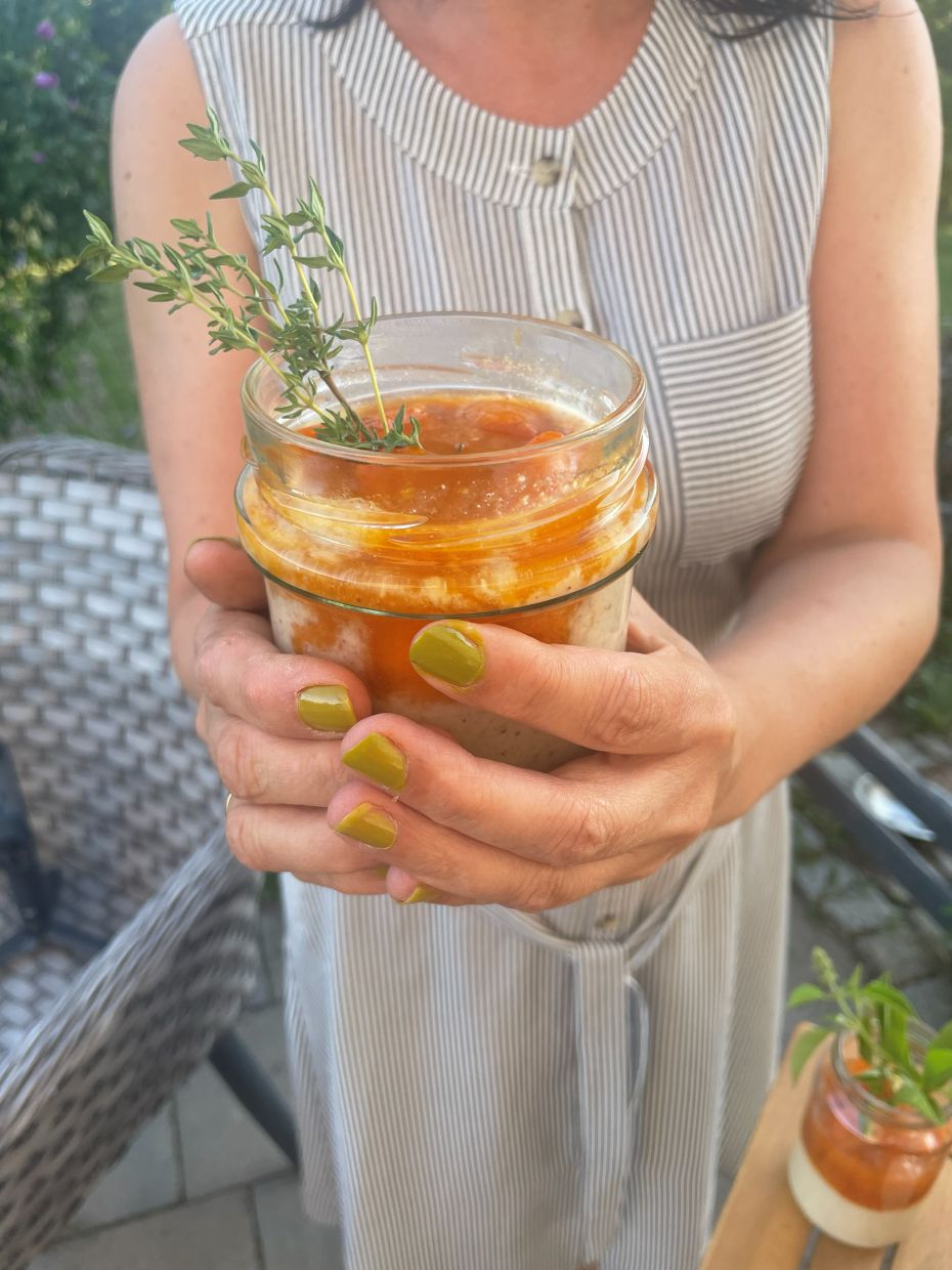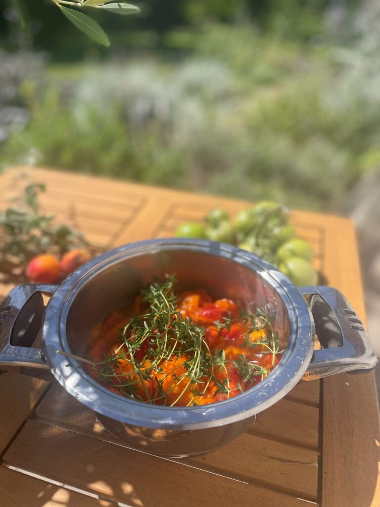 Jedną z takich scen pamiętam bardzo wyraźnie. Przygotowałam deser z morelami w syropie tymiankowym — wszystko pachnące, otulone aromatem tymianku. Usiadłam przy ogrodowym stoliku, w letniej sukience, delikatny makijaż, paznokcie pomalowane, wszystko gotowe do zdjęć. Światło było idealne, ciepłe, miękkie.